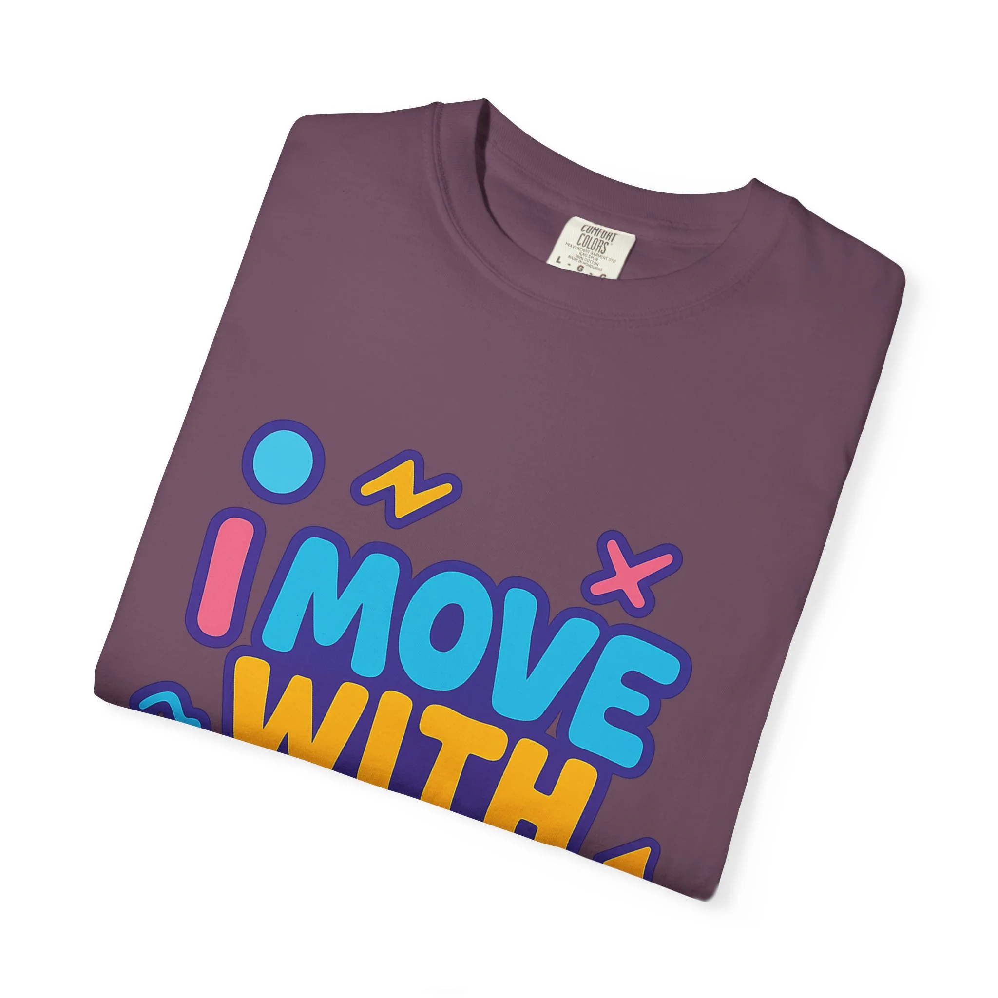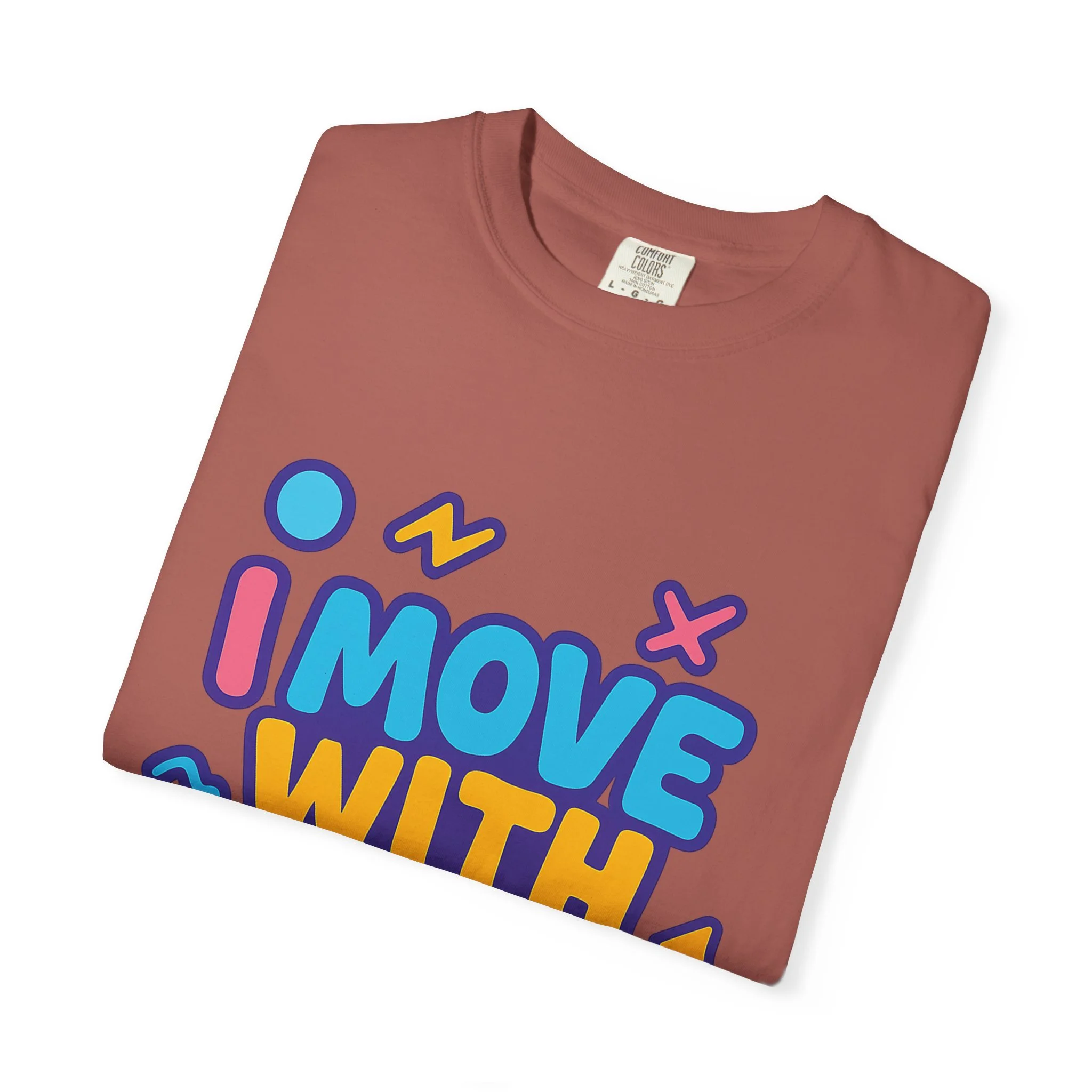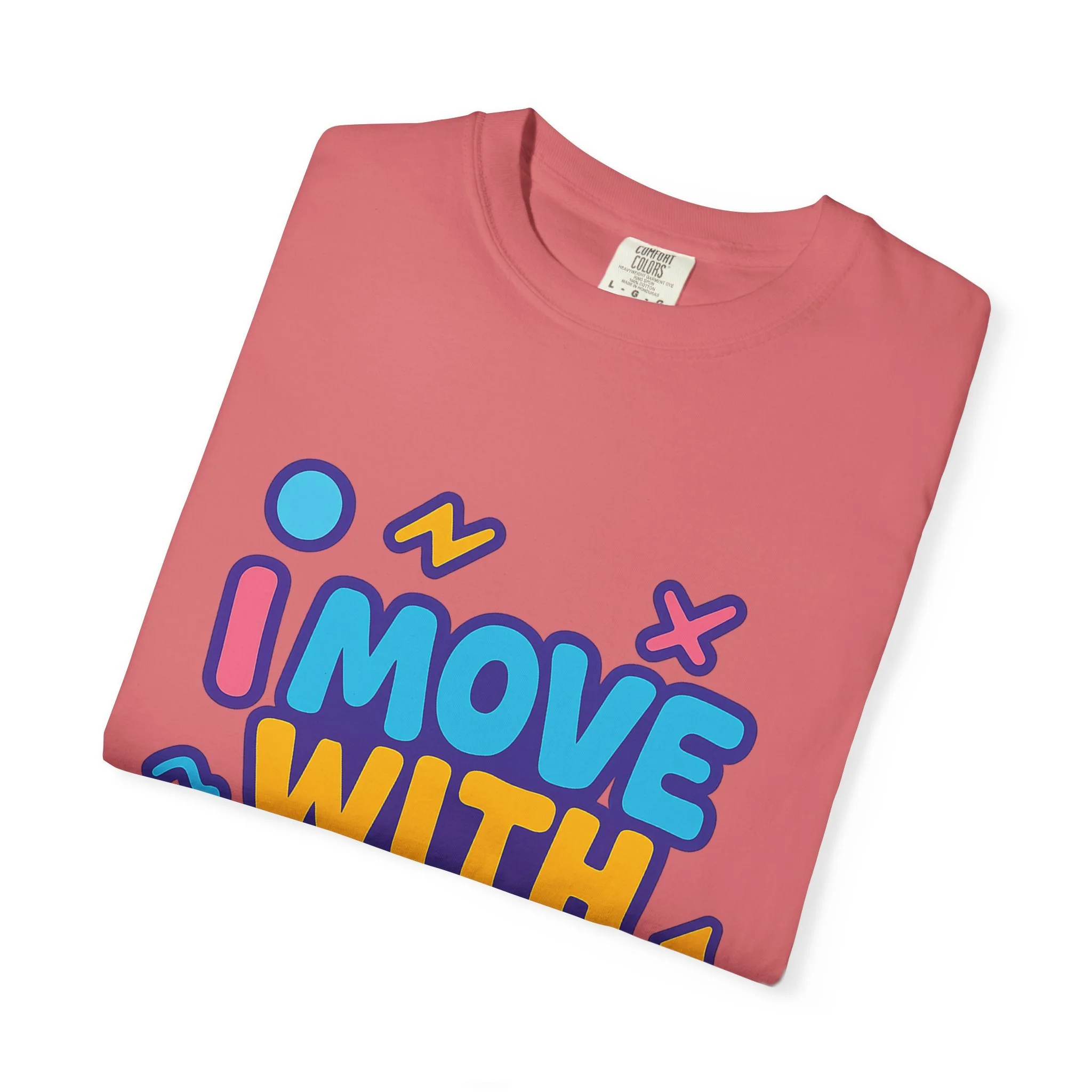 Lightweight but substantial, this garment-dyed tee carries a bright, playful statement across the chest: “I MOVE WITH MEANING.” The bold, rounded lettering and cheerful accent shapes feel optimistic and confident—made for people who make choices with purpose and want their clothes to reflect that. The soft, broken-in hand of the garment-dyed cotton and relaxed cut create an easy everyday shirt you’ll reach for on busy mornings, community events, and slow weekends alike. Wear it layered under a jacket on volunteer days, or solo when you want your values to speak first. The colors pop on a clean white canvas, keeping the message front-and-center without shouting.